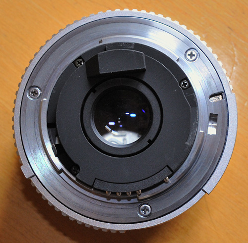 Mount of the Nikkor 45mm f/2.8 P, silver version. |